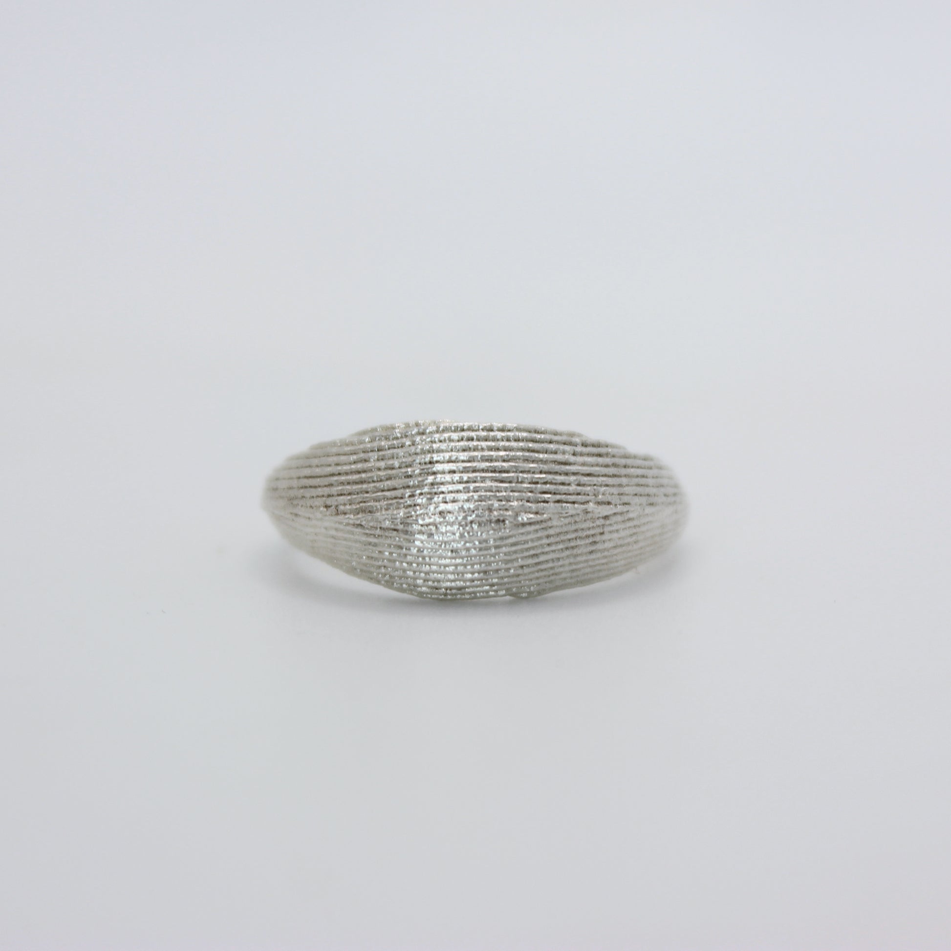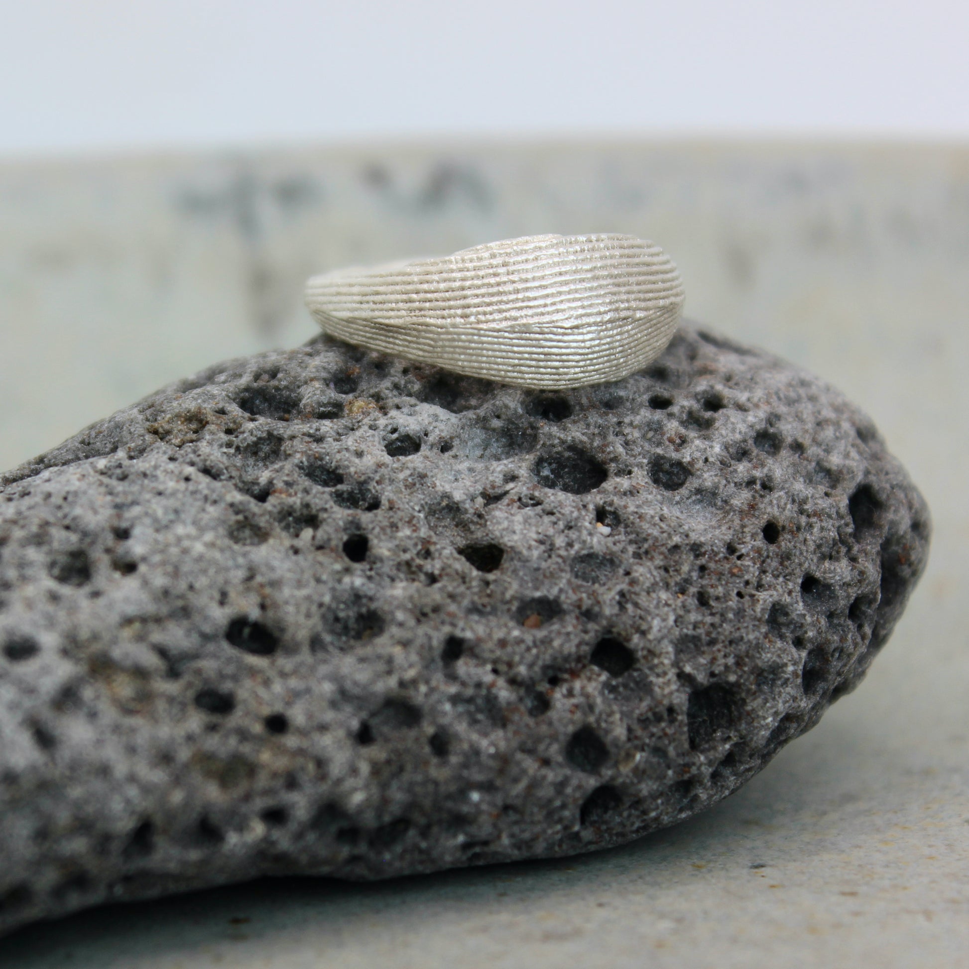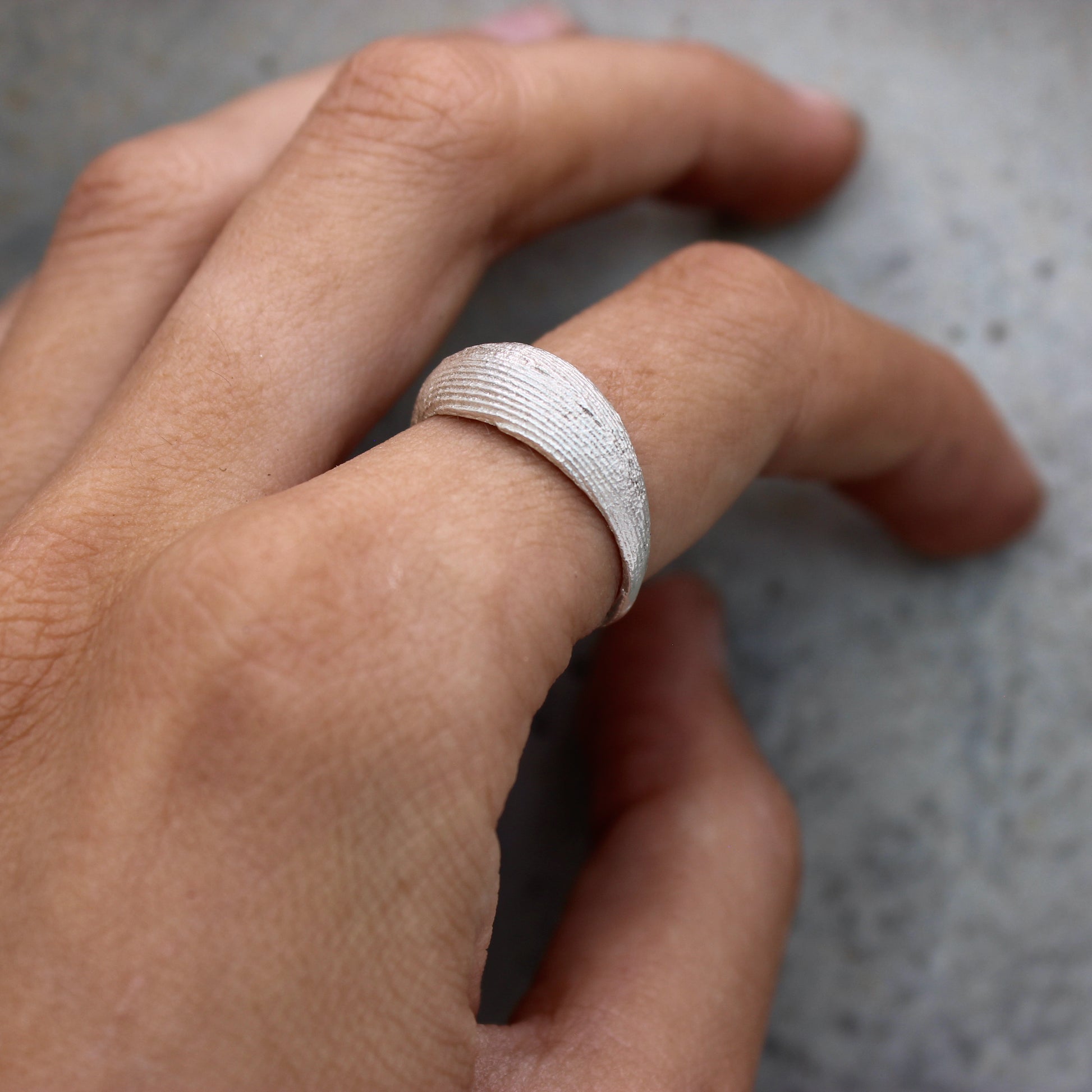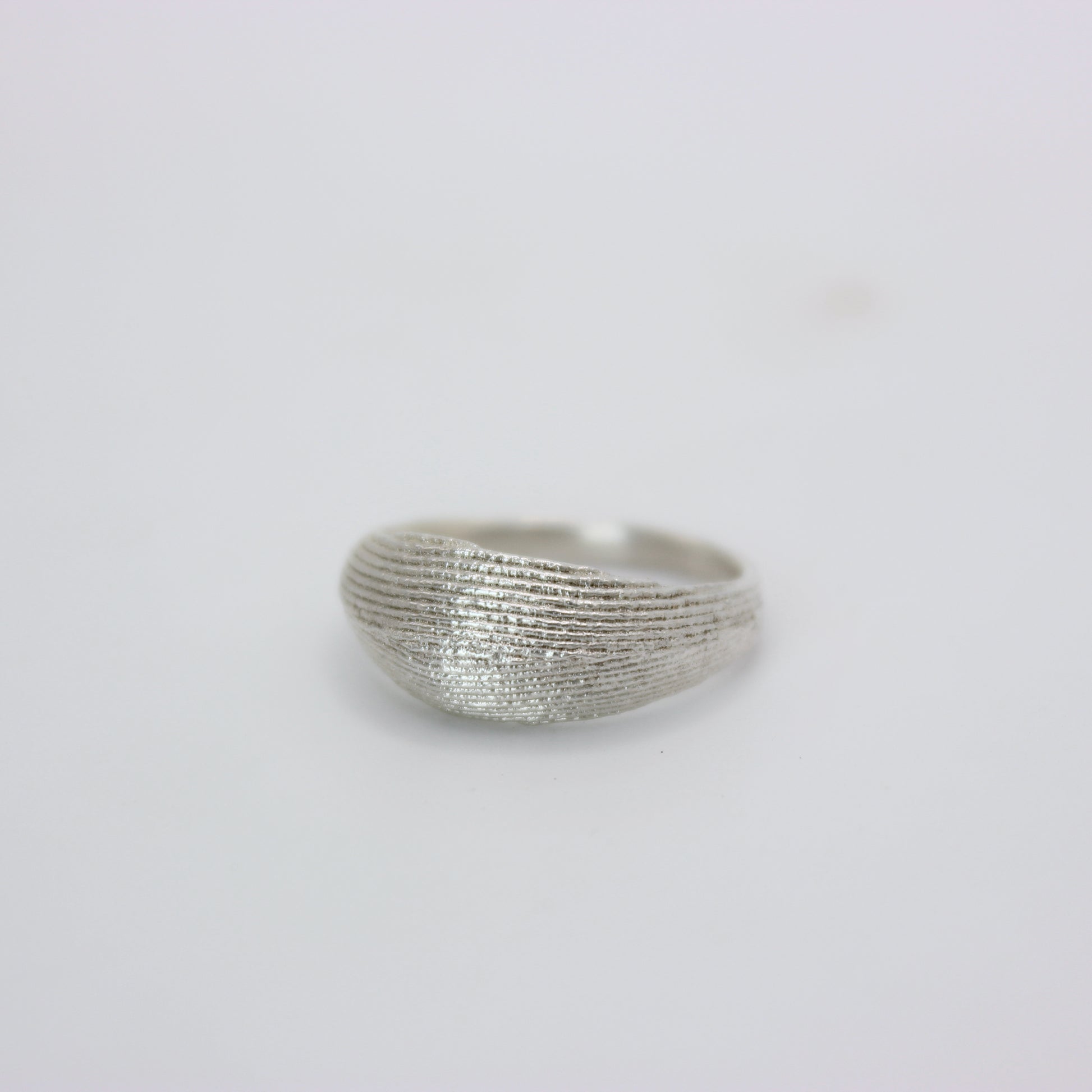 A simple contemporary design which emphasises the natural imprinted texture. The domed bold ring gives a sense of being brave and fear from fear, and not afraid to take up space.